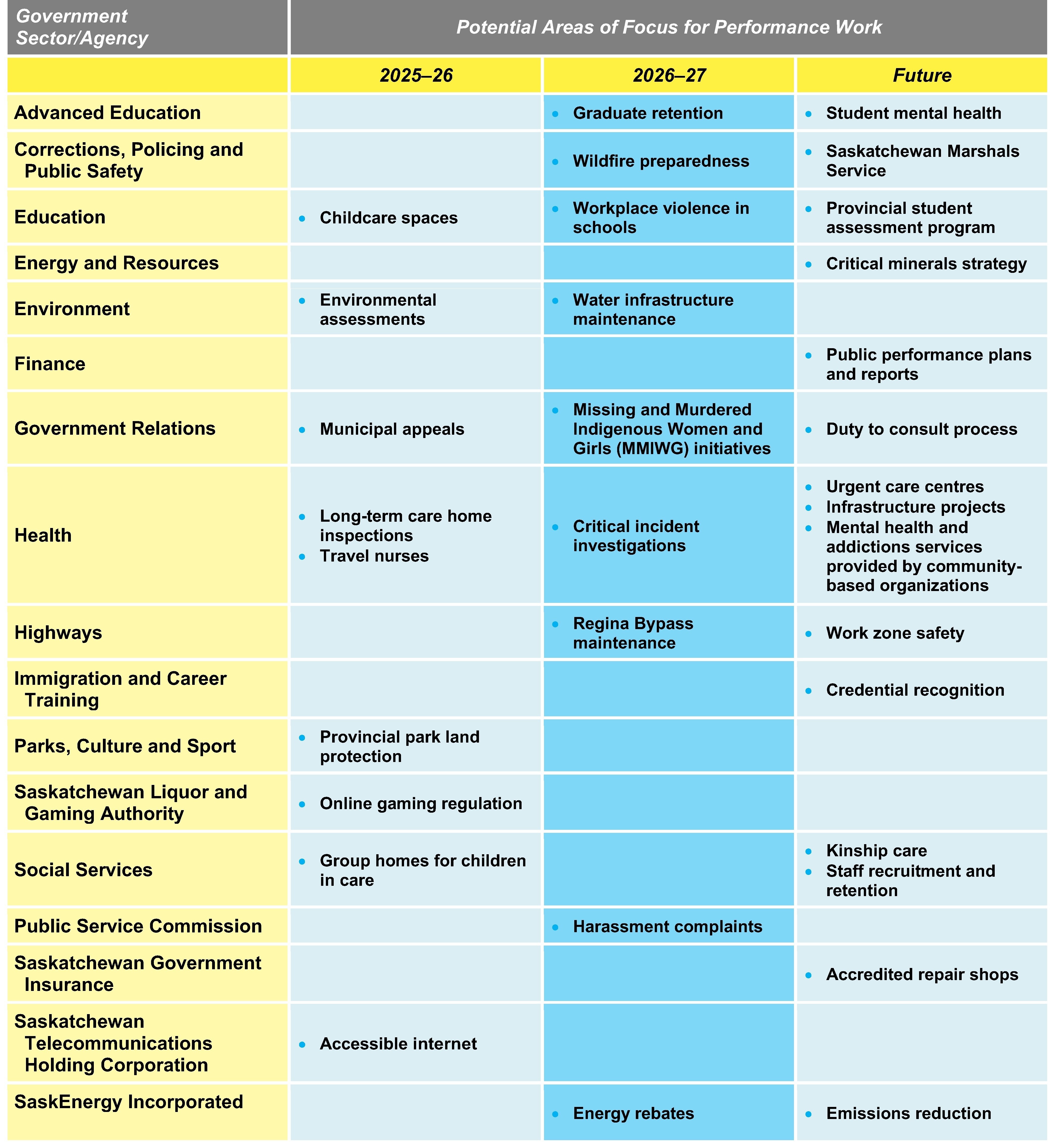 The Office’s annual planning process includes determining potential areas of focus for our future performance work. We anticipate performance audit work in the following areas over the next three years: